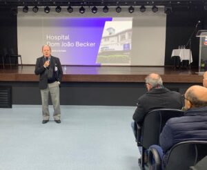 Durante a reunião, representantes do Hospital Dom João Becker apresentaram um panorama da instituição, que integra a Santa Casa de Misericórdia. A apresentação foi conduzida pelo superintendente Olímpio Dalmagro e pelo diretor médico Fernando Issa.